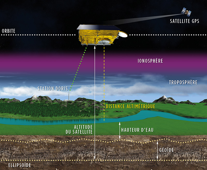 L’instrument principal est un altimètre. L'onde radar émise par l’altimètre se réfléchit sur la surface de la mer et est renvoyée vers le satellite. Celui-ci mesure le temps aller-retour et analyse la forme d'onde reçue, permettant respectivement de déterminer la distance entre le satellite et la surface de la mer ainsi que la rugosité de la surface, qui découle de la hauteur des vagues. L'altitude de la surface de la mer est ensuite déduite de la différence entre l'altitude du satellite et la distance mesurée. Utilisé sur les océans, notamment pour suivre la circulation océanique et le niveau moyen des mers, ce principe a été utilisé progressivement pour mesurer la hauteur de l’eau sur les grands fleuves et sur les grands lacs. Une science est alors née : l’hydrologie spatiale.